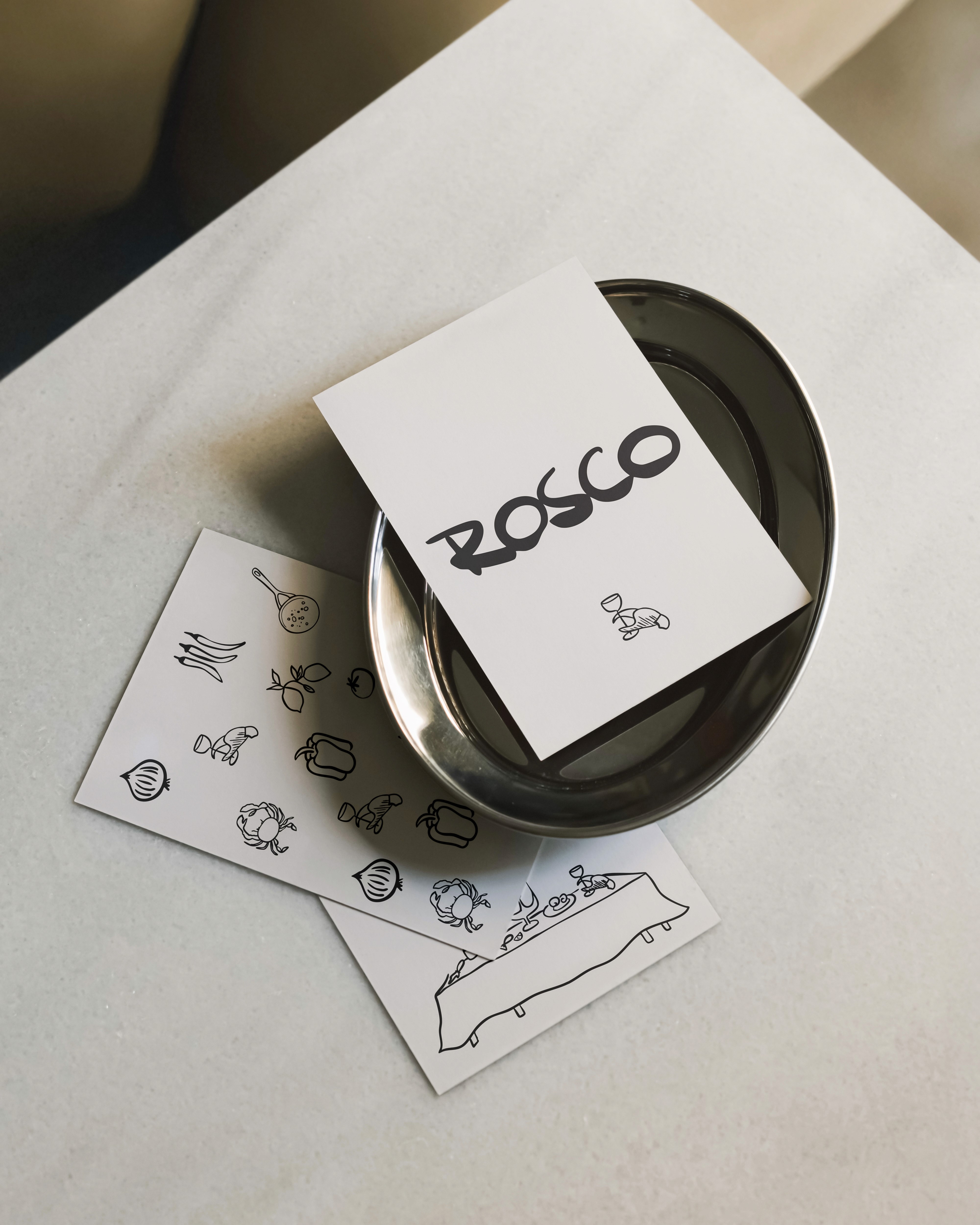 The visual identity combines sharp typography, moody tones, custom illustrations, and offbeat details to reflect Rosco’s distinctive style. Photography focused on food, atmosphere, and detail.